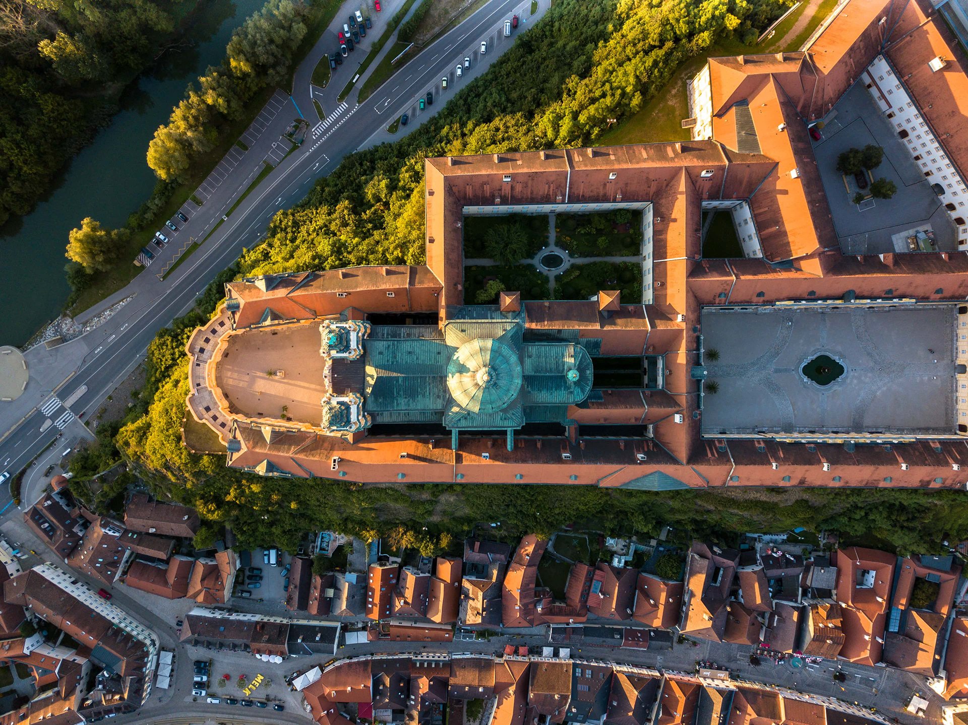 Melk Abbey is a Benedictine abbey above the town of Melk, Lower Austria, Austria, on a rocky outcrop overlooking the Danube river, adjoining the Wachau valley. Shot on Hasselblad with CMOS on Mavic 3 aerial platform